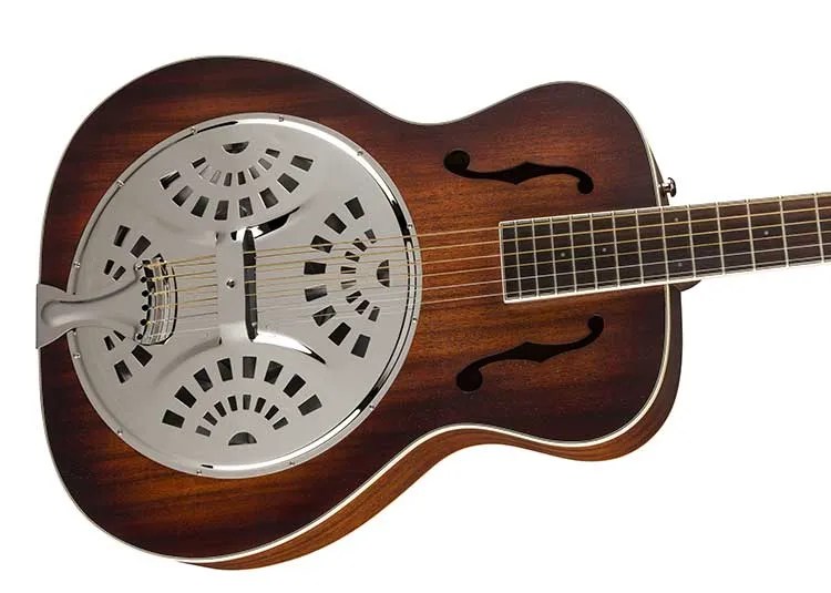 BODY Laminated mahogany top, back, and sides; spider cone resonator; trapeze tailpiece; 55mm bridge string spacing; satin Aged Cognac Burst finish