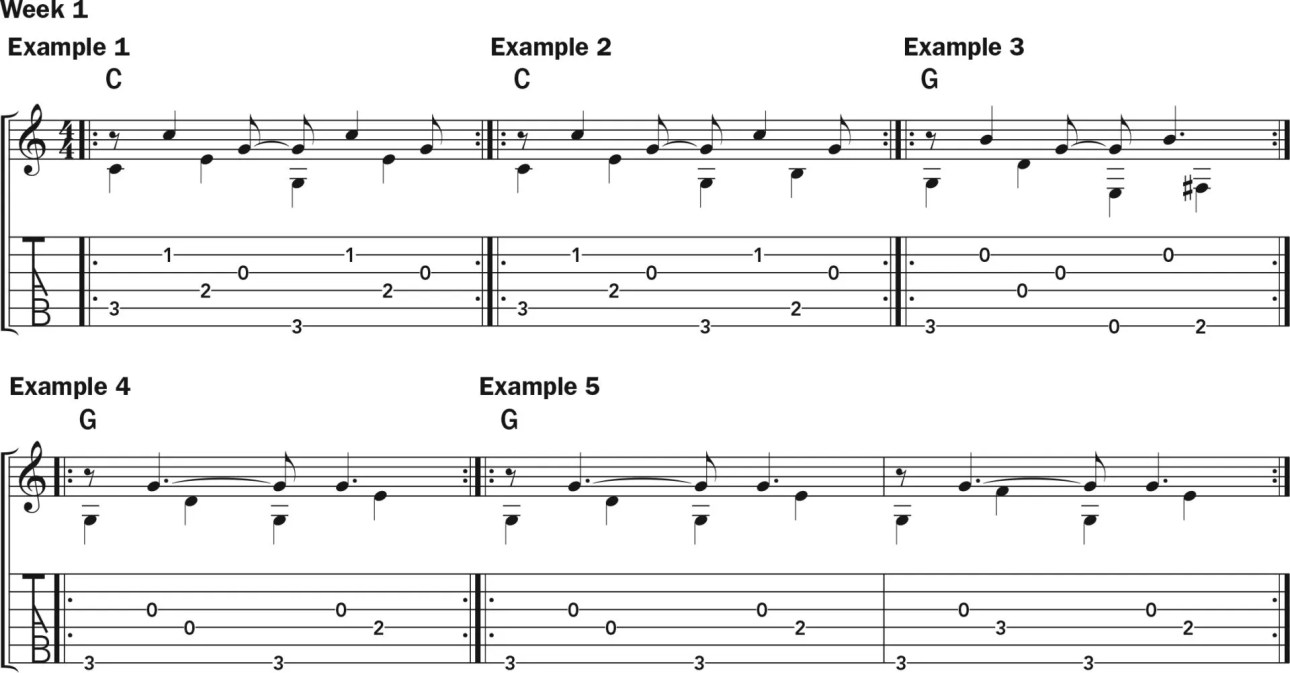 Another great variation on the standard root-fifth alternation is to alternate the fifth of the chord with the major sixth, creating a different kind of double alternation: root–five, root–six. This often doesn’t change the string you’re picking but introduces a new fretting-hand note on the same string. Check out Example 4 for a cool bass sound you could use in a blues context. In Example 5, we add the flatted seventh note to imply a seventh-chord sound.