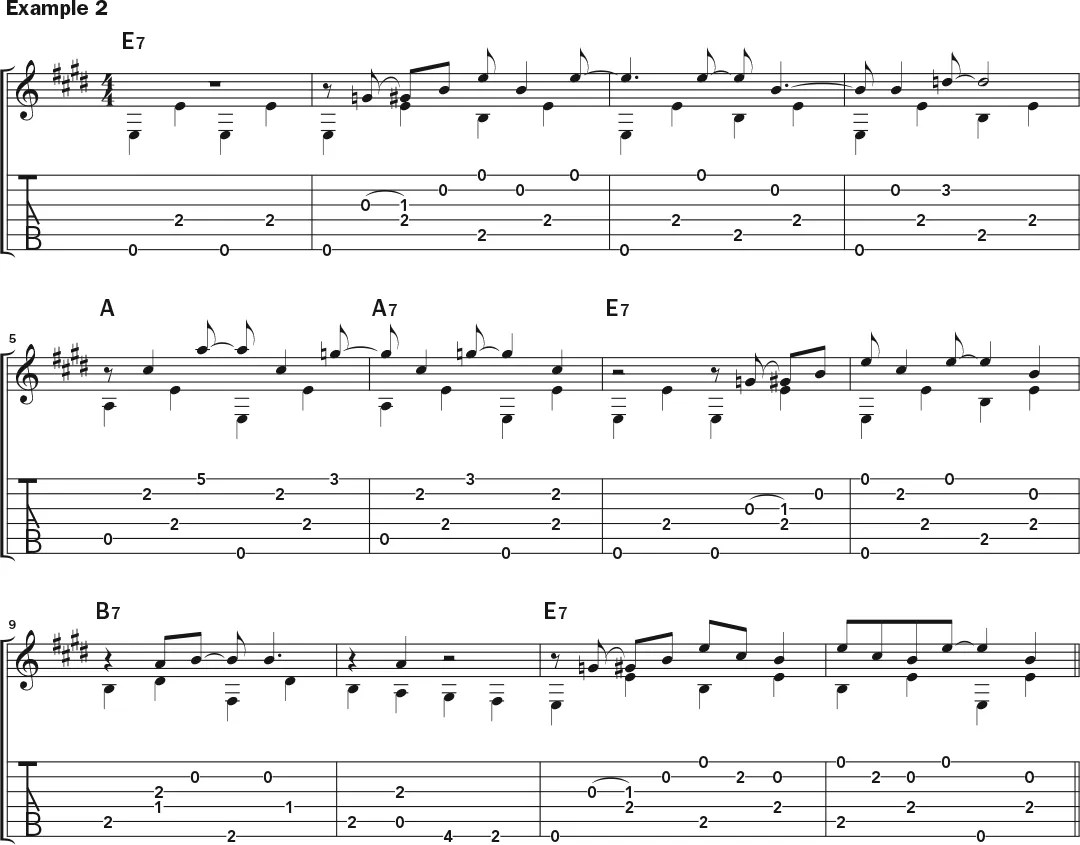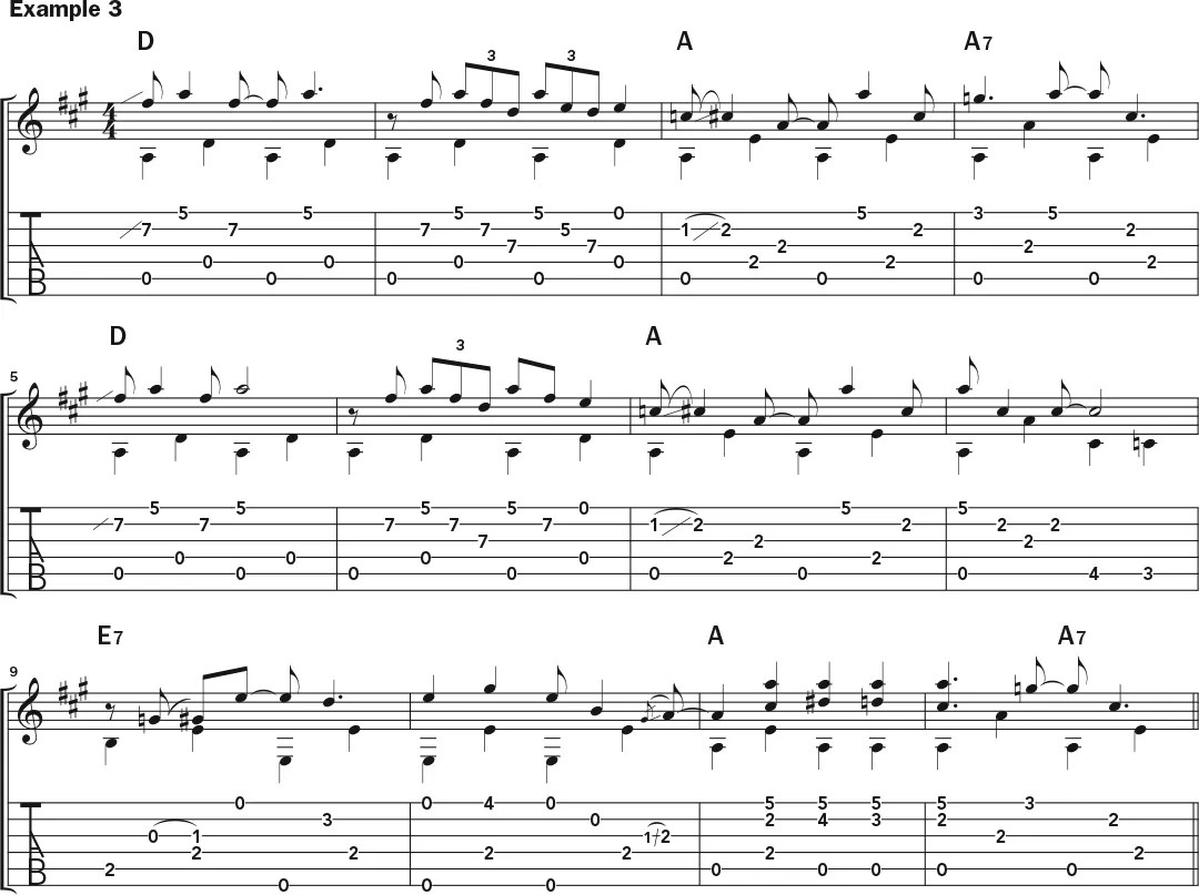 Happy Traum, with his vast teaching experience, knows how to get to the heart of Hurt’s playing particularly well. He is fond of the guitarist’s melodic riffing up the neck (Example 3) and demonstrates this approach using a D chord at frets 5–7, with the open first string used in a clean transition to a first-position A chord. The phrase used around the E7 chord in bars 9 and 10 is similar to the one in Sebastian’s arrangement of “Avalon Blues,” with the addition of a high G#—a real finger-stretcher.