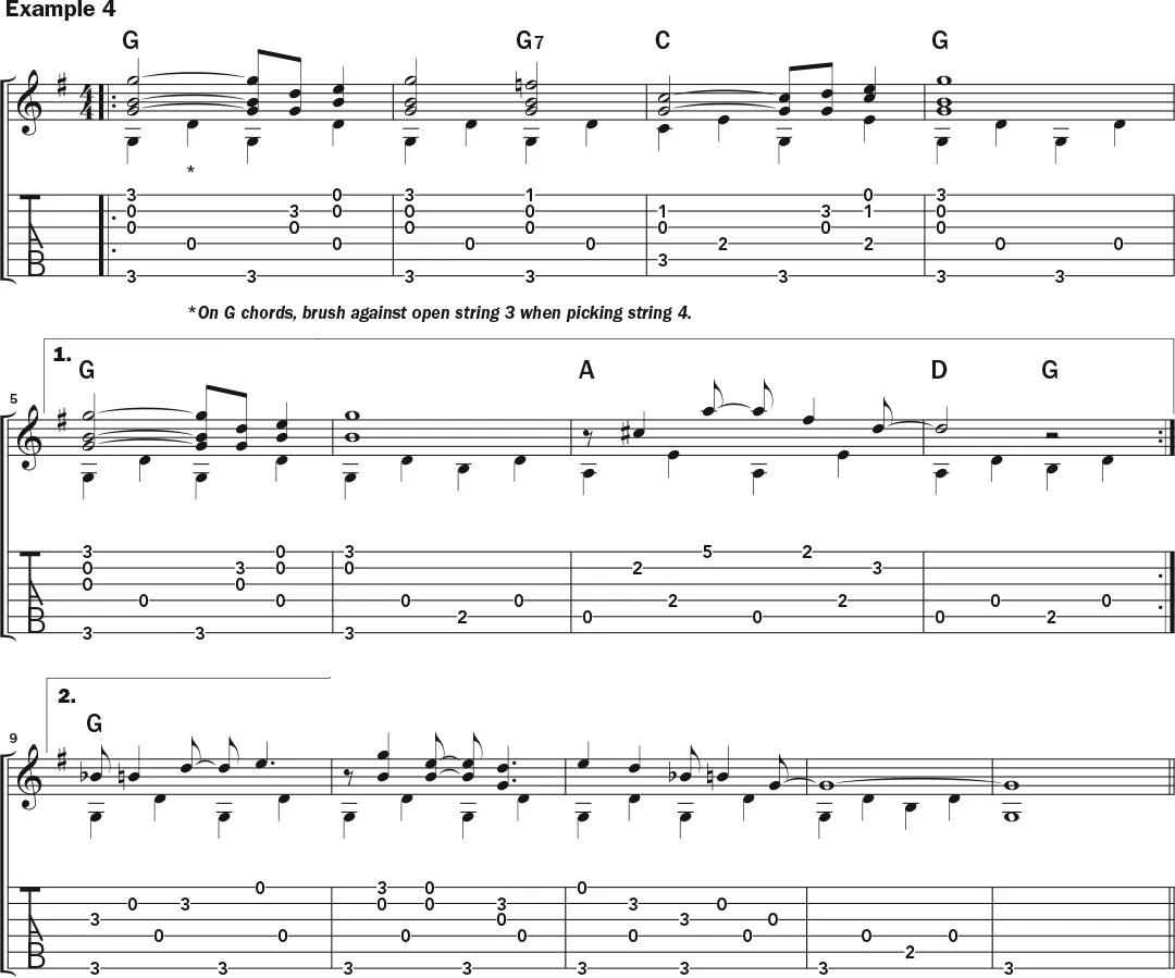 In Example 4, as with Sebastian’s “Spike Driver,” your fourth finger gets a fretting workout, and the melody notes are the same. Listen for that quick C-chord change in the third bar; also add a major third (B) to the G-to-D bass line in bar 6 just before the change to A. Again, the open A string is pedaled through the A chord and that two-beat change to D just before the resolution on G in bar 8—another common Hurtism, which typifies the less-is-more approach that makes his guitar music so enjoyable to listen to and to learn.
