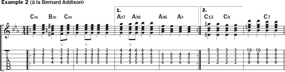 Through his early associations with innovators and legends such as James P. Johnson, Jelly Roll Morton, Bubber Miley, and Louis Armstrong, Addison was very much in demand during the dawn of the era. In 1933, he joined one of the most important big bands of the period: Fletcher Henderson’s orchestra. For 18 months, he was part of a groundbreaking swing rhythm section that included pianist Henderson, bassist John Kirby, and drummer Walter Johnson. Recordings such as “Happy Feet” (English Parlophone, 1933) reveal Addison’s very personal and slightly idiosyncratic rhythm feel. Using a mix of both down- and upstrokes, at times rife with banjo-like syncopation, Addison pushed the beat with a subtle emphasis on the offbeats. Does it still swing? Of course it does! But, as depicted in Example 2, the effect is perhaps closer to what contemporary guitarists associate with la pompe manouche of Gypsy jazz (see a lesson on this style in the June 2017 issue).