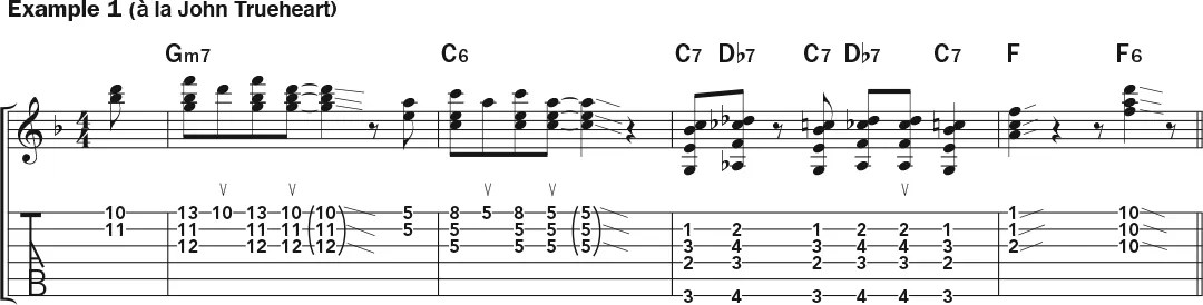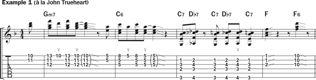 On the latter, Trueheart demonstrates a 1930s swing guitar device: the four-bar intro, as shown in Example 1. Working primarily with tonic and dominant fifth chord forms, the guitar has the ability to both set the tempo and establish the harmonic framework of the song. As was commonplace early on, Trueheart embellishes these relatively simple chord forms with some slides and chromatics for effect. Of equal importance on a recording such as this is Trueheart’s strong sense of the rhythm pulse of his beat: a steady 4/4 but with some slight syncopated emphasis on offbeats here and there.