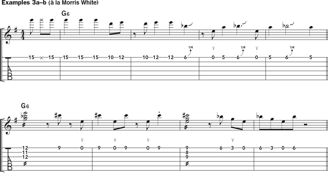 Of course, heavy strings and higher action both go a long ways towards swinging on one string, but in White’s case, it’s extremely effective. The banjo experience comes to the fore with the second break (Example 3b), in which White deploys the type of tremolo often associated with the brash metal-bodied instrument. It’s a technique that is best practiced slowly with a lighter-gauge pick at first, switching to a heavier plectrum once speed and even strokes have been developed.