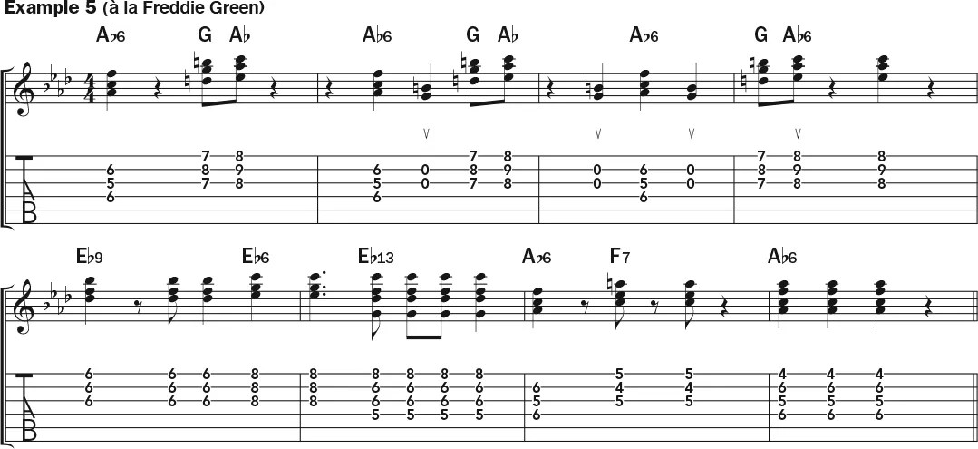One of Green’s early activities away from the Basie fold was a summer 1938 recording session for the Hot Record Society with clarinetist Pee Wee Russell alongside stride master James P. Johnson, Ellington’s early bass bedrock Wellman Braud, and drum innovator Zutty Singleton. While a slight aberration from the standard swing band of the day, the integrated group’s performance of “Dinah” not only offers insight into how Green felt the beat, but includes a rare 16-bar chord-based solo. Using chromatics in a manner similar to Al Casey, Green plays relatively simple chord forms utilizing basic harmonic ideas, as shown in Example 5. But his mastery of time is already apparent, as he mixes in subtle syncopations and emphasizing offbeats, most effectively in his second eight bars. Similar rhythmic ideas appear in early Basie broadcast recordings as well. Additionally, his accompaniment during Johnson’s solo offers some early insight to his voice-leading ideas.