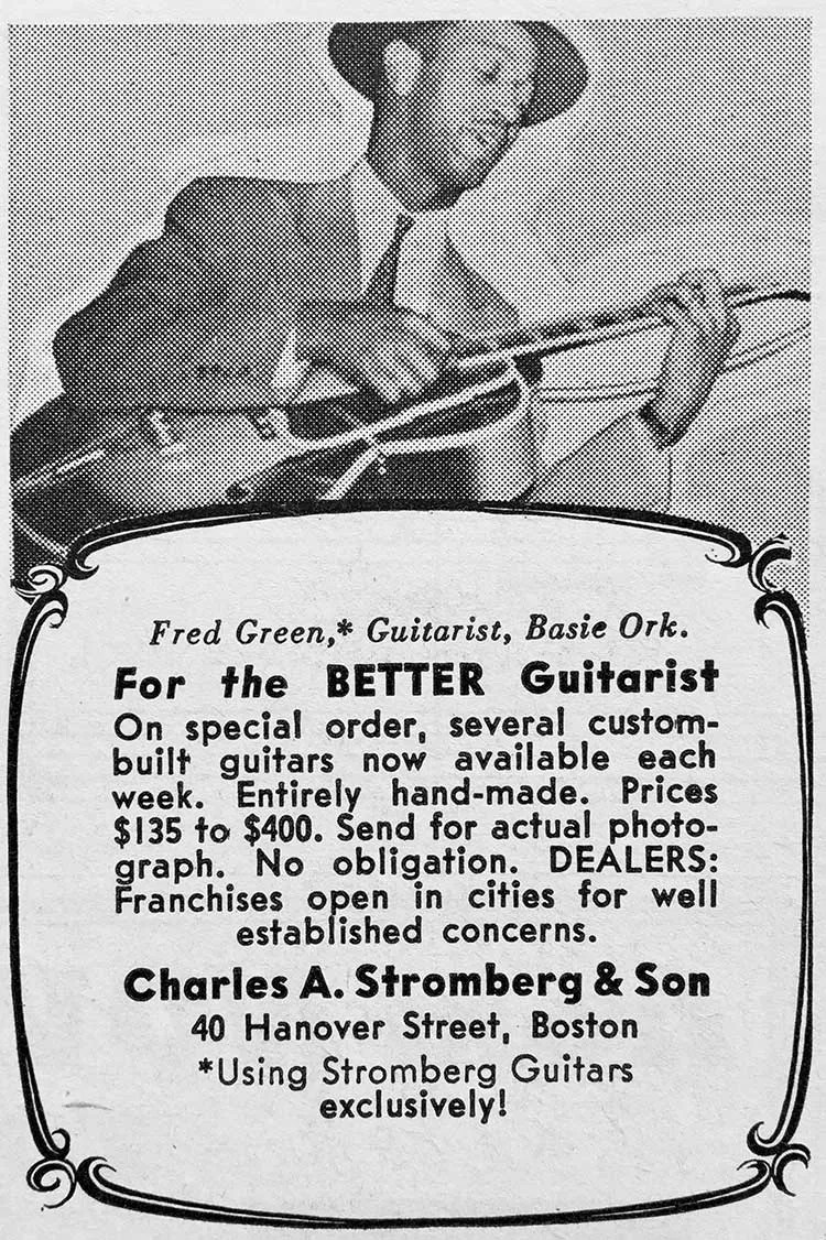 Photos of Green before Basie show the guitarist with a smaller New York–made Epiphone Triumph, which he replaced with Epiphone’s top-of-the line Emperor not long after he joined the orchestra. By early 1939, Green played a Stromberg Master 300, made by the legendary Boston guitar shop. It was this instrument that Green played throughout the 1940s.