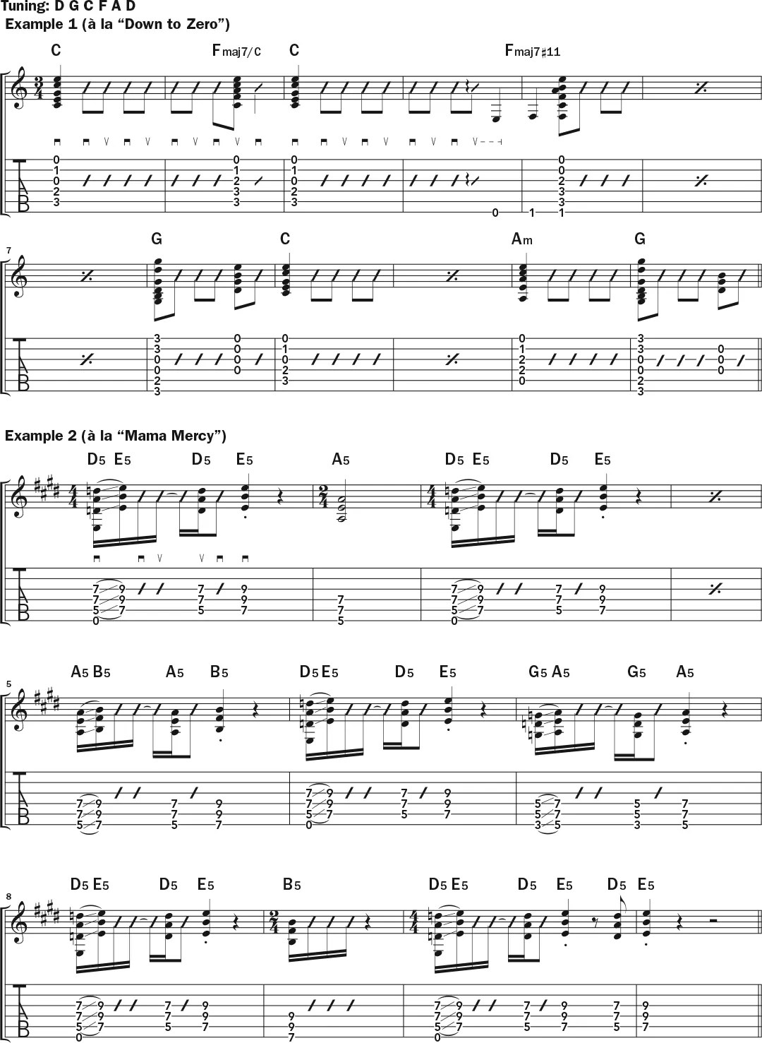 Example 5 is based on the intro to “I Like It When We’re Together,” the opening track on Not Too Far Away, played on a low-tuned Martin. Play fingerstyle, picking the notes in each chord simultaneously with your thumb and fingers, and add a light slap with your picking fingers on beat 4. At the end of the intro, add one beat (see the change to 5/4) before resuming in 4/4 in the verse. Continuing in the song, she switches to strumming for the chorus. Her guitar arrangements often use these kinds of textural changes to create contrast from section to section.