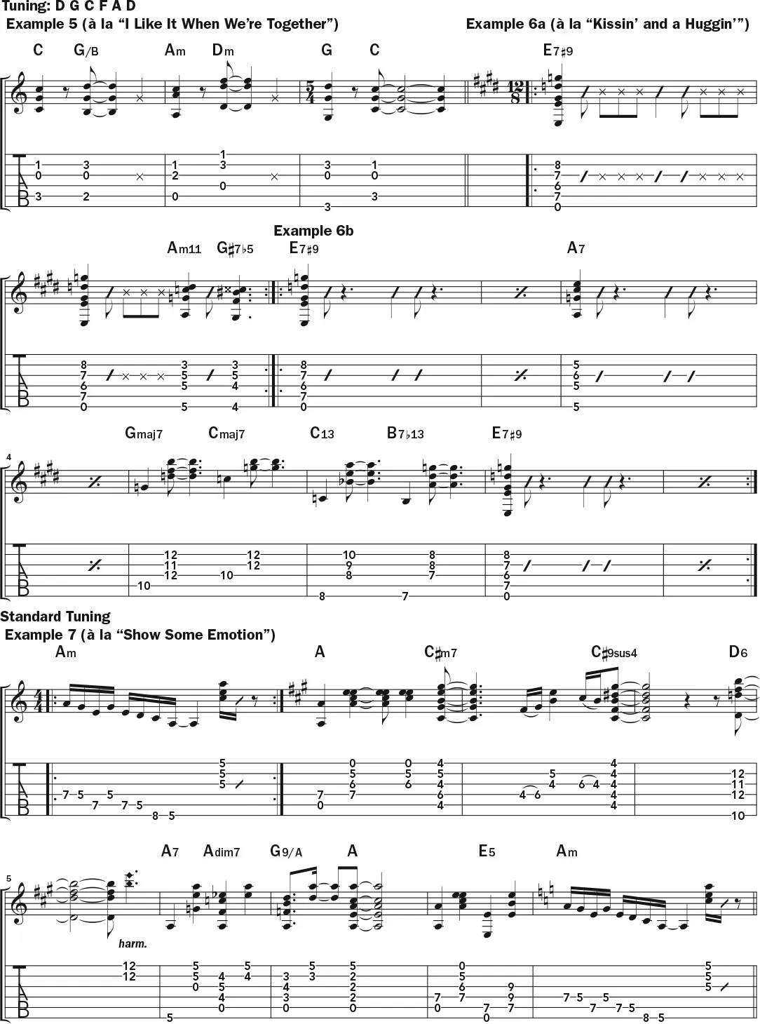 Then the chorus of “Show Some Emotion” modulates to A major and goes into a string of minor seventh, ninth, sixth, and diminished chords, as in measures 2–9. Between the D6 and A7, play quick natural harmonics at the 12th fret on the top two strings to suggest a passing E chord. (This is a touch I noticed in live footage.)