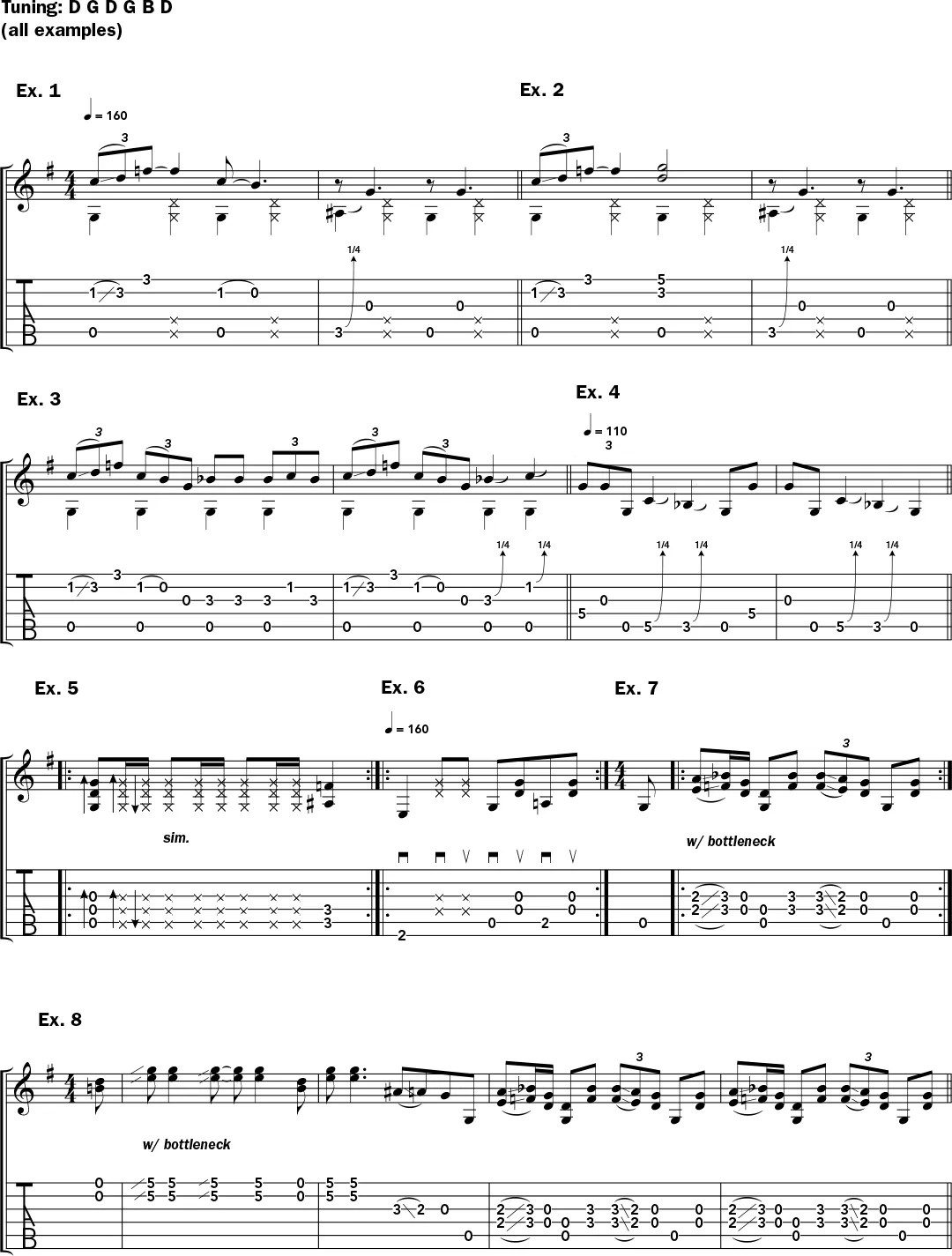 In Ex. 8, insert the opening phrase from “Rollin’ and Tumblin’”: a double-stop played on the first and second strings, which then transitions to the midrange groove from Ex. 7. Keep your slide low and evenly angled over both strings, as it’s easy to misgauge your slide angle and not make good contact with the strings.