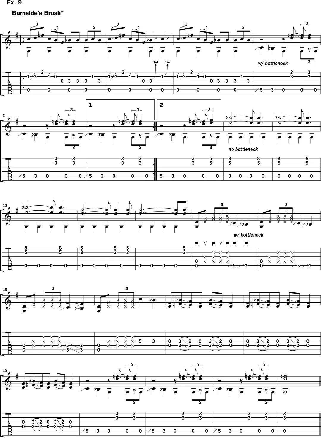 Burnside played fingerstyle, using mainly his thumb. To cop his sound in Ex. 1, use your thumb to brush the strings while simultaneously palm muting the bass strings—remember, allow your picking-hand palm to rest gently on the strings near the bridge. As for your fretting hand, play the notes on strings 1 and 2 with your first finger.