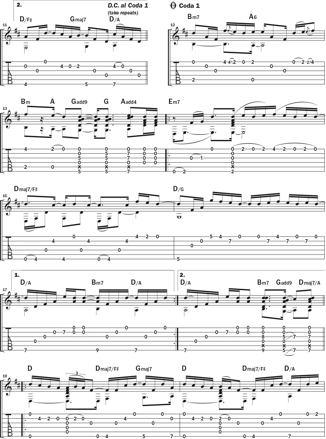 Williams says that the compositional process for “New Beginnings” was fairly simple. Tuning her guitar to open D, and placing a capo at the fourth fret, she sat down, started playing, and immediately happened upon the main theme (bars 1–2 of the notation here). “The other sections of the piece pretty much wrote themselves,” Williams says. “I believe this particular composition took me about a week to finish, which is a lot shorter than the usual amount of time I spend composing songs.”